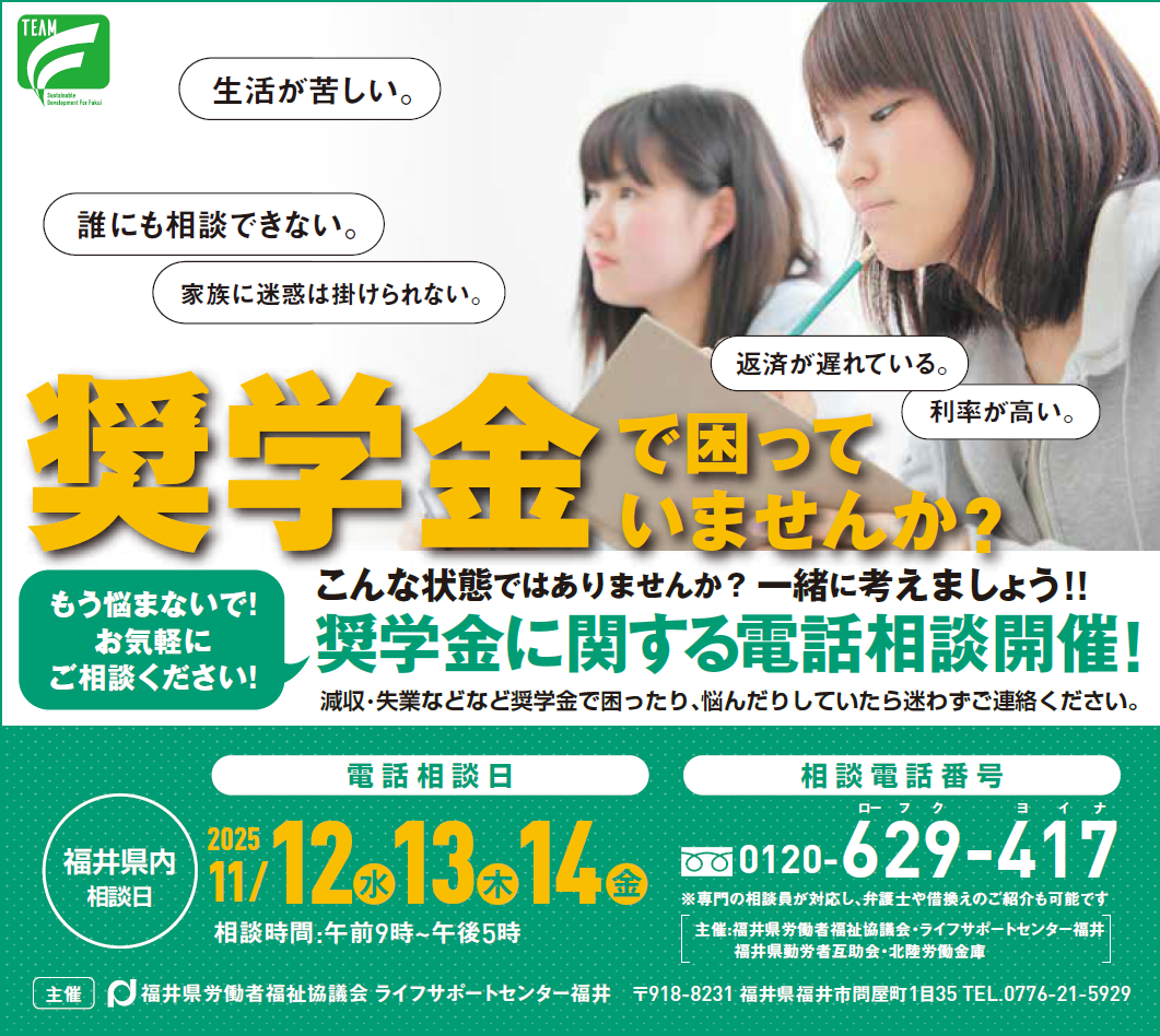 福井県労働者福祉協議会(ライフサポートセンター福井)では、2025年11月12日(水)~14日(金)の3日間「奨学金に関する電話相談」を行います。