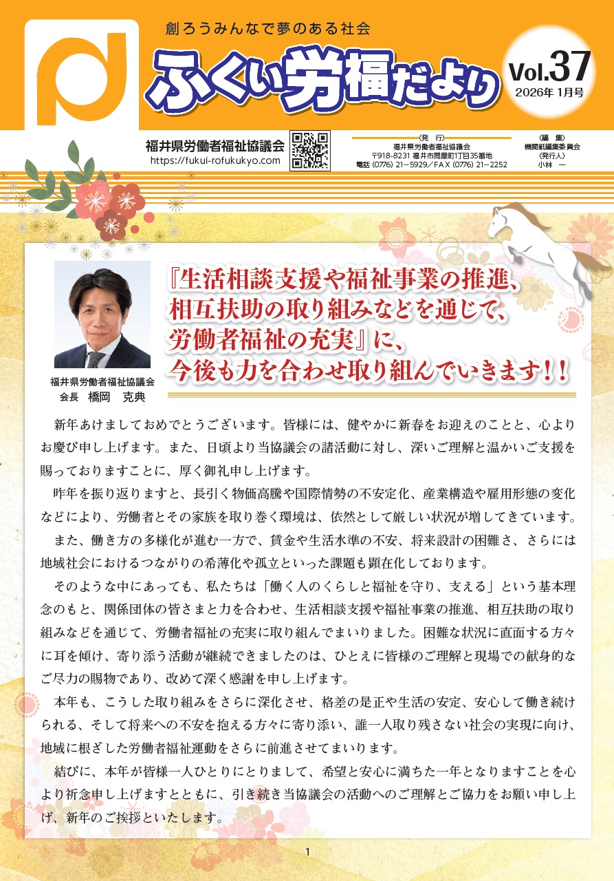 ふくい労福だよりvol.37を発行しました! 新年のご挨拶、労福協活動報告、各福祉事業団体からのお知らせなどを掲載しております。 ☆★新春お楽しみクイズ★☆ 正解者の中から抽選で「労福賞」1名様、「事業団体特別賞」5名様、「お年玉賞」20名様にプレゼント! =応募締切= 2026年2月28日(土)必着 メールまたはハガキでご応募ください。 皆さまからのたくさんのご応募をお待ちしております。